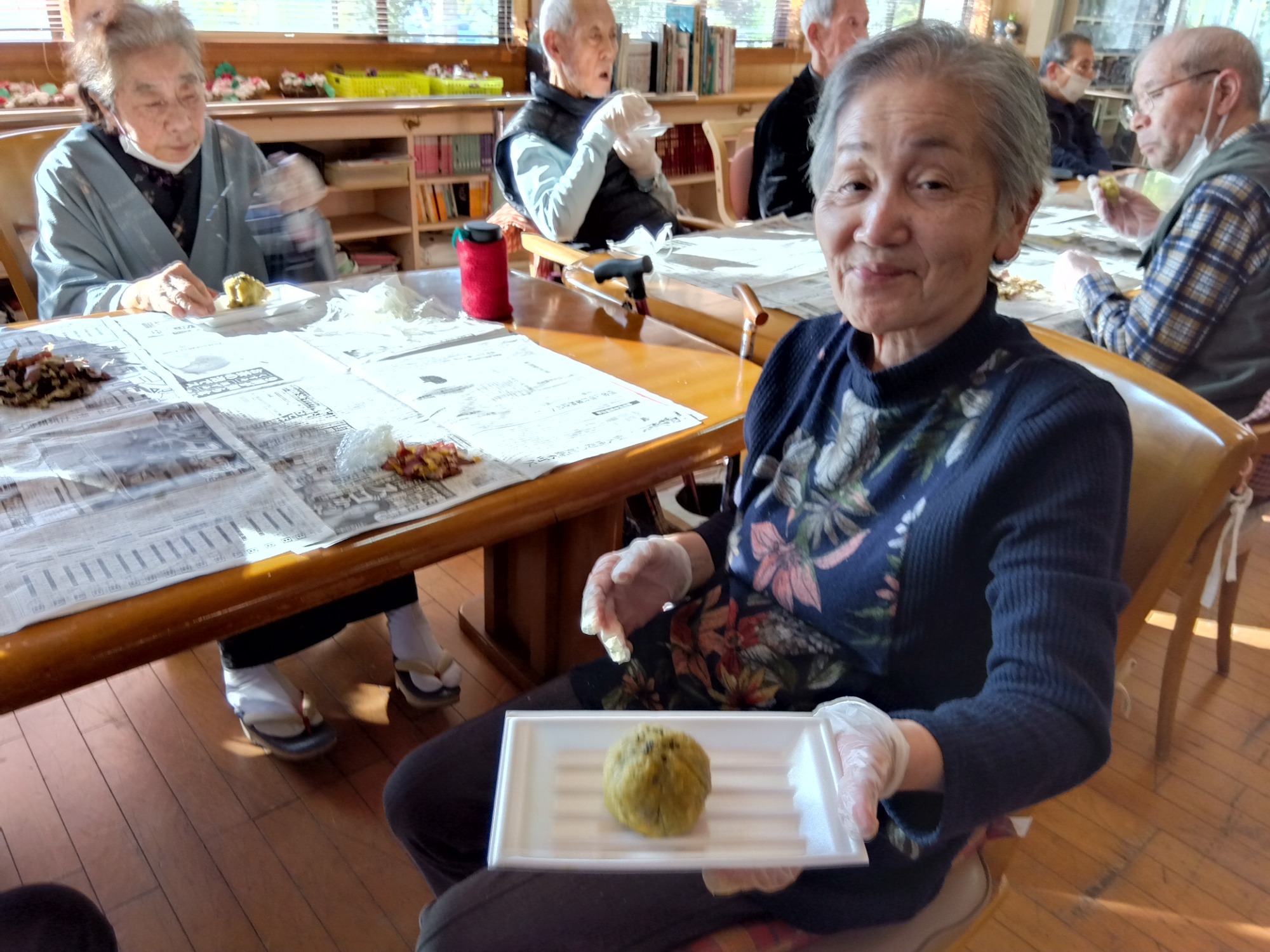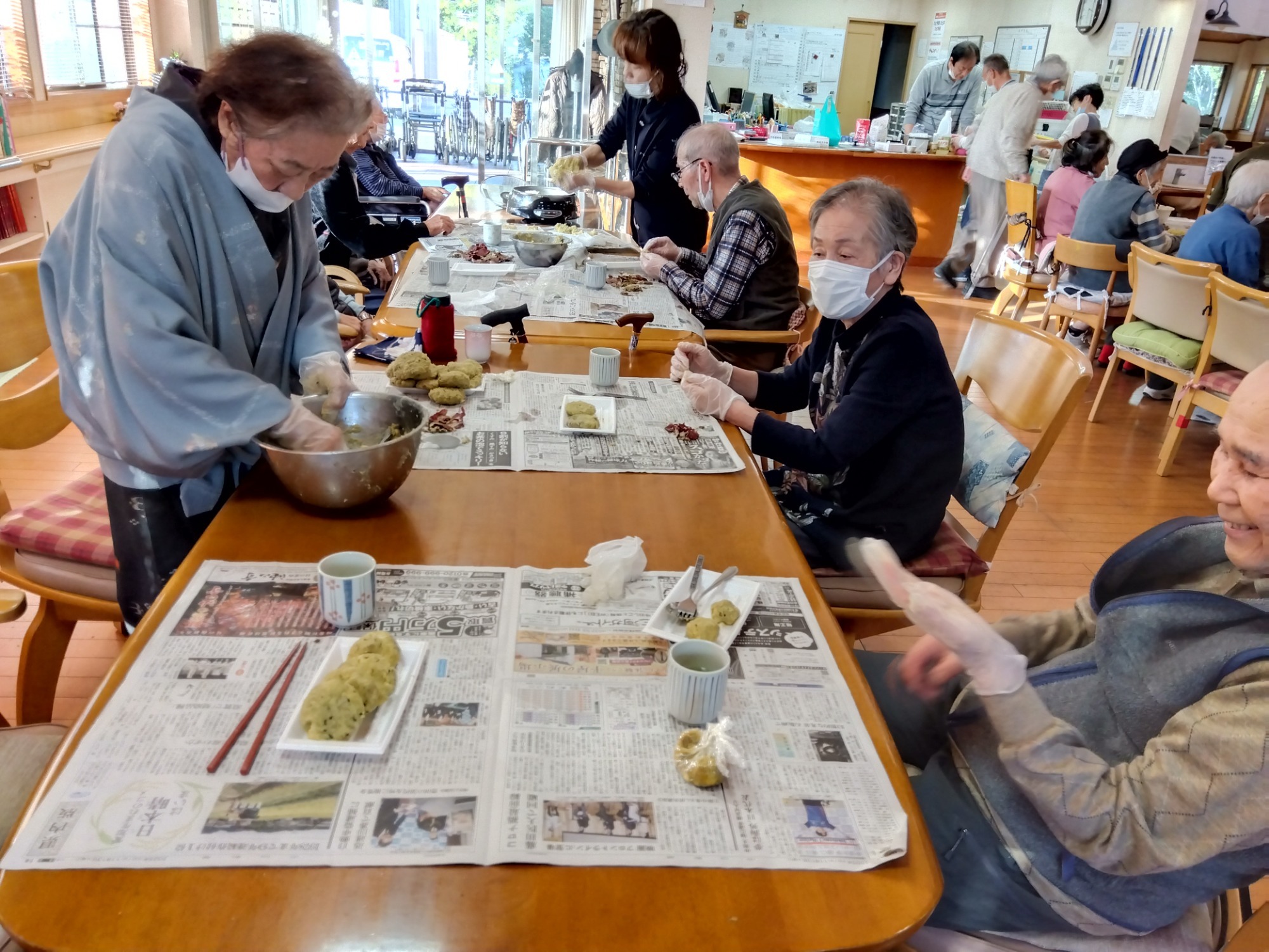 みなさんと一緒に、秋の味覚・さつまいもを使って 茶巾しぼり と ソフトクッキー 作りに挑戦しました。下ごしらえから形を整えるところまで、みなさんが協力しながら和気あいあいと作業され、楽しそうな声があちこちから聞こえて きました。