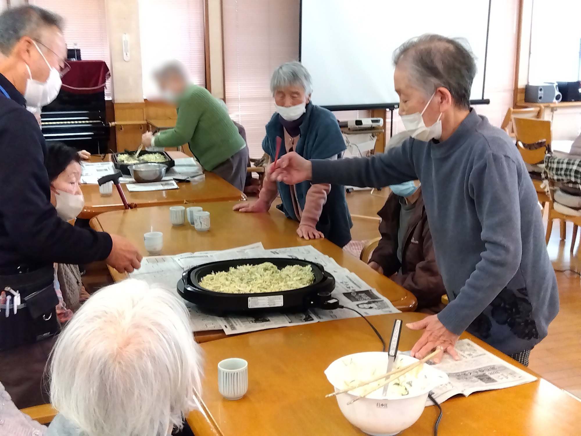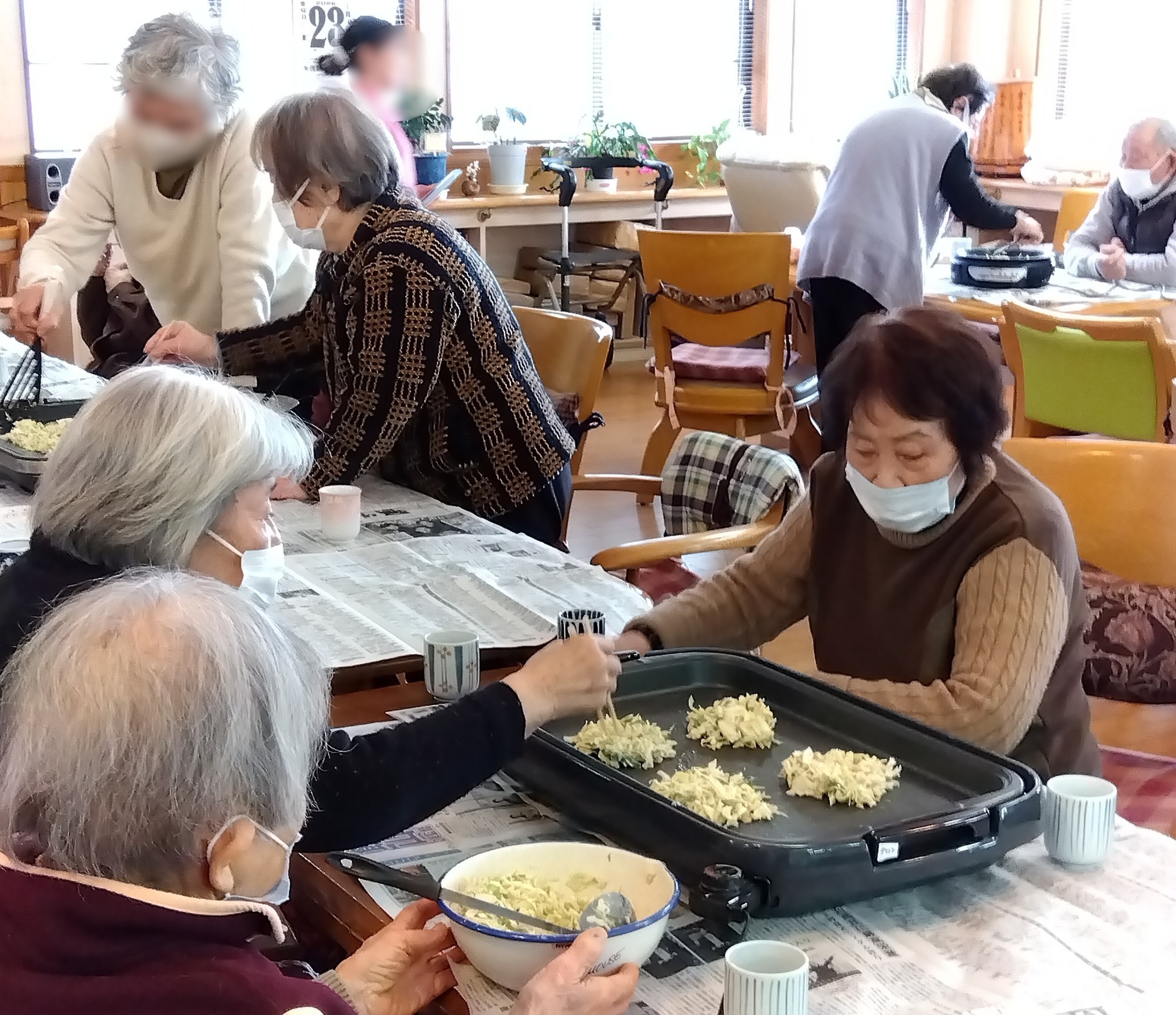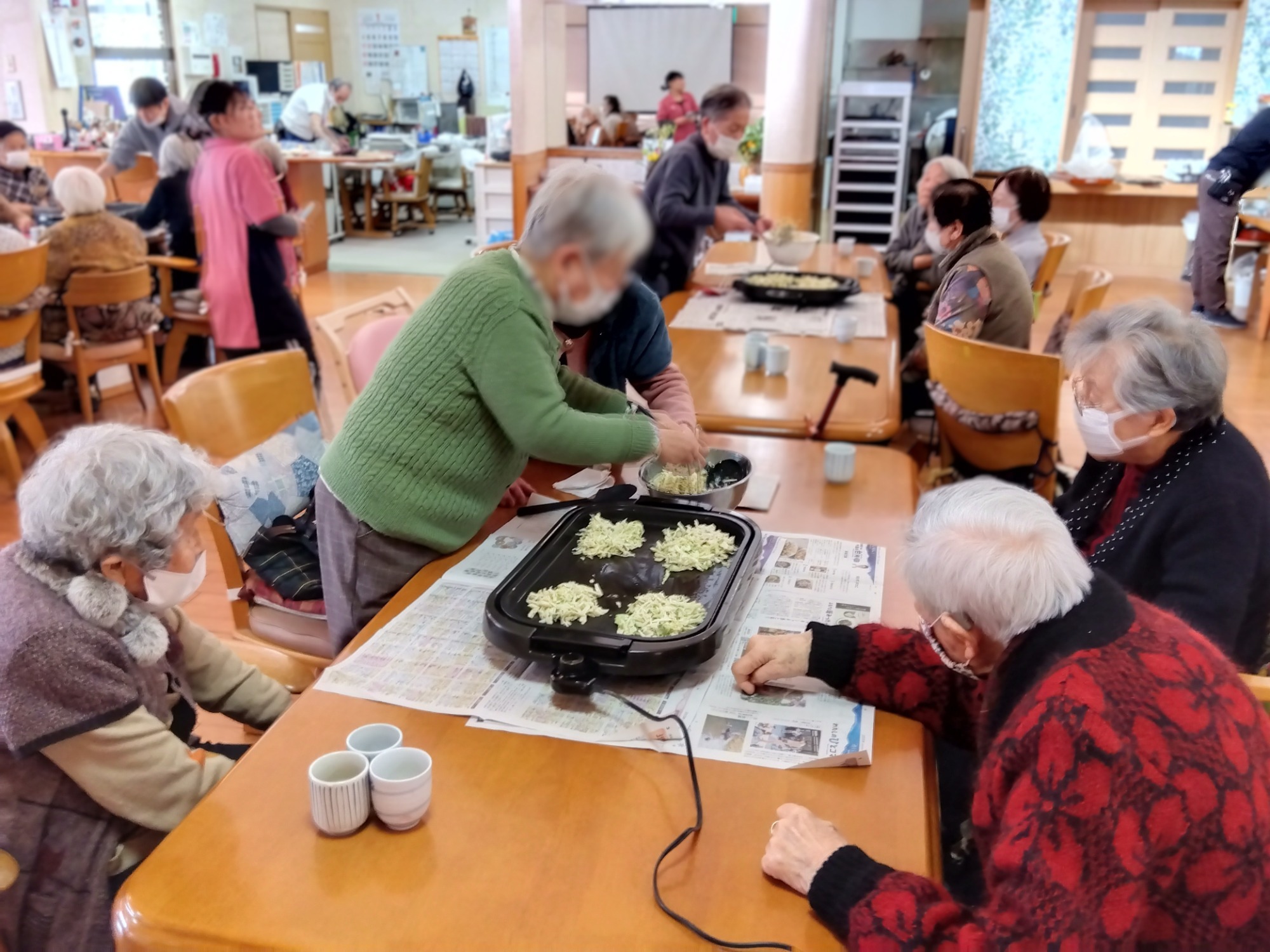 本日のデイサービスでは、皆さまと一緒にお好み焼きを作りました。調理中は会話も弾み、笑顔あふれる時間となりました。